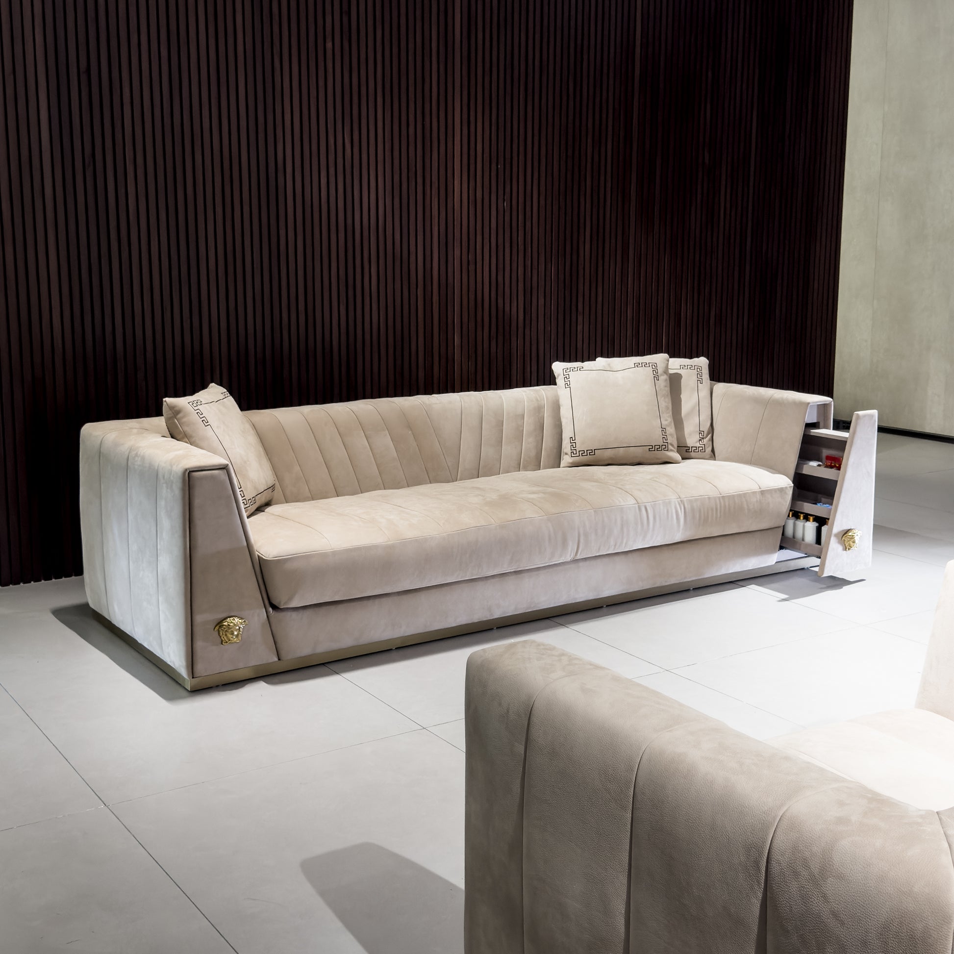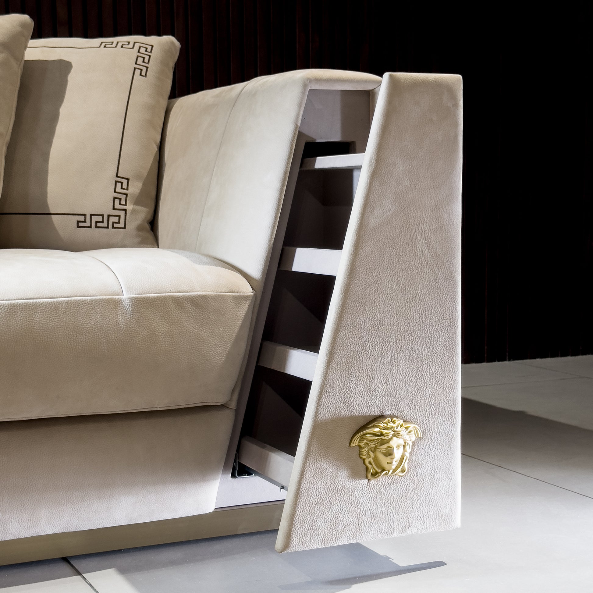 This sofa is made of Anti-fouling frosted cowhide from Italy. This material makes the sofa more dignified and orderly. The armrests of the sofa can be used for hidden storage.
