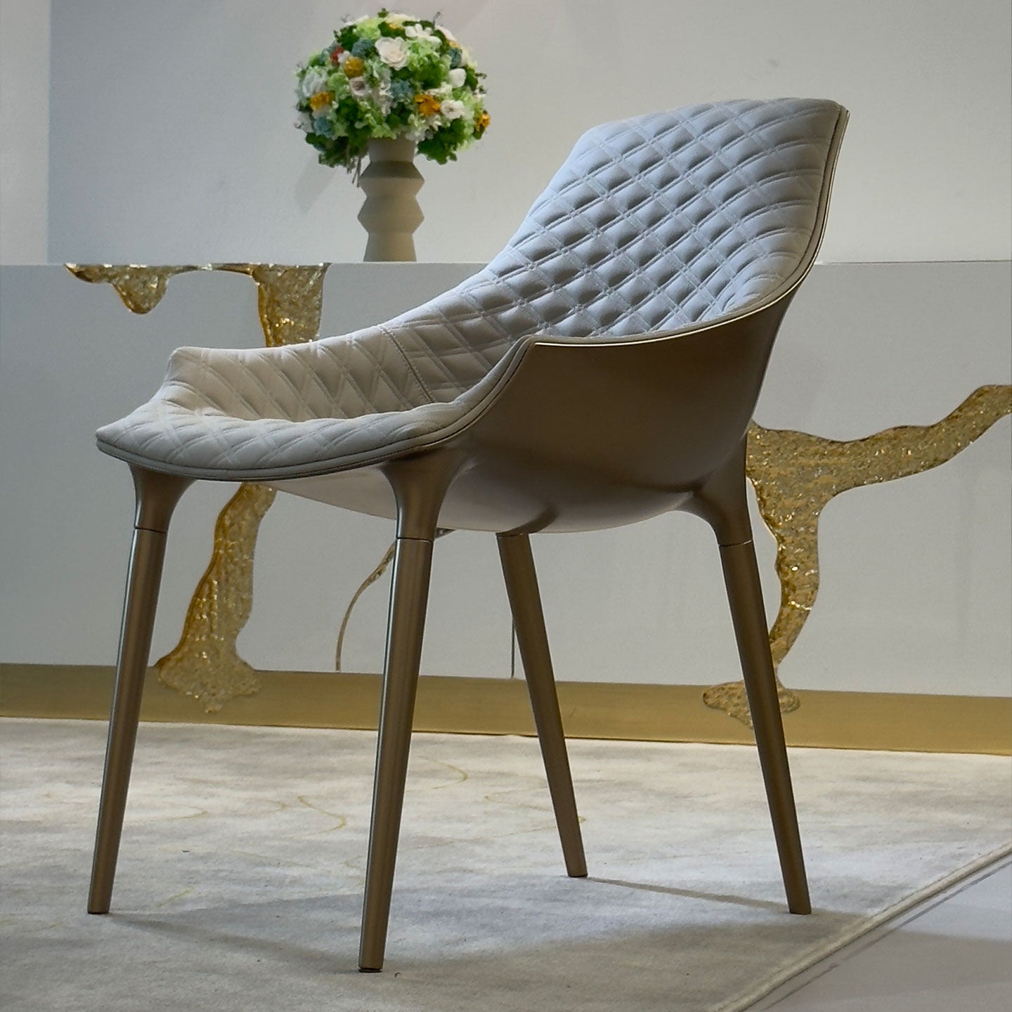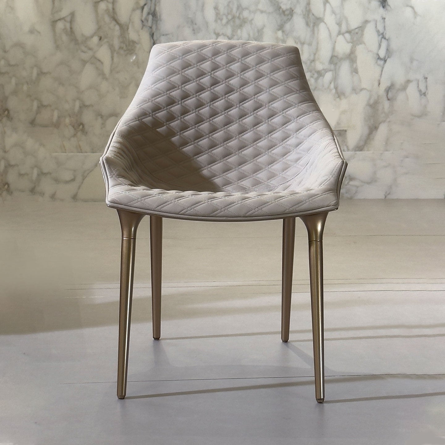 The Milady Chair features a stain-resistant frosted leather upholstery. Its frame, constructed from ABS and die-cast aluminum, pairs exceptionally well with the retro-style diamond-stitched detailing on the finish.