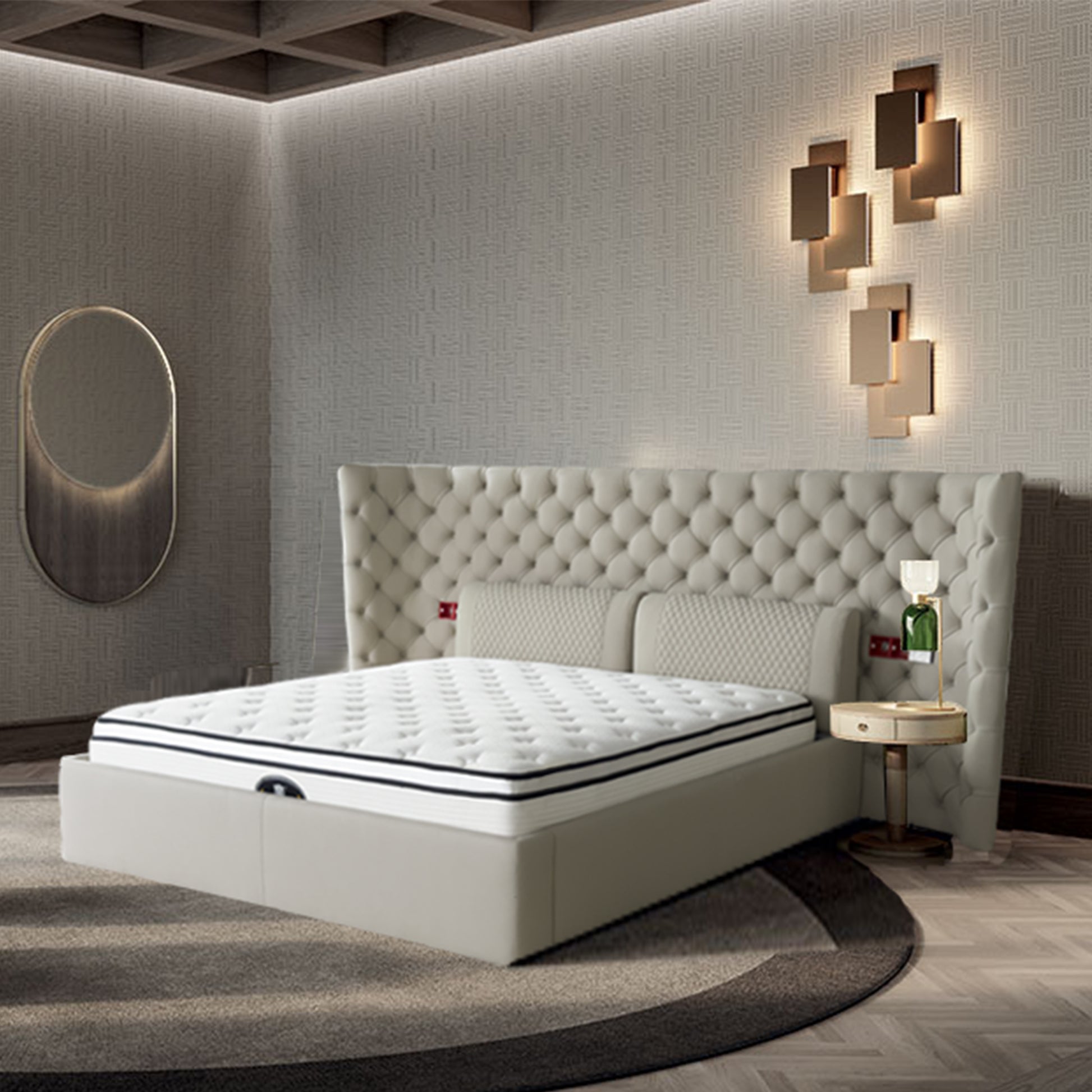 The outline of a very simple bed frame develops into a continuous line that becomes a solid headboard with precious handmade features: this is the Medici bed. Headboard and bed frame in brushed cowhide.