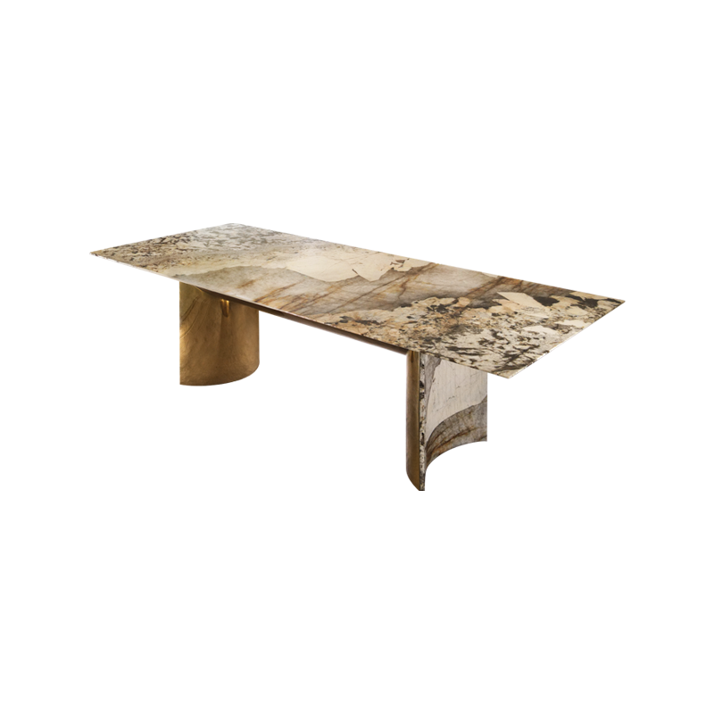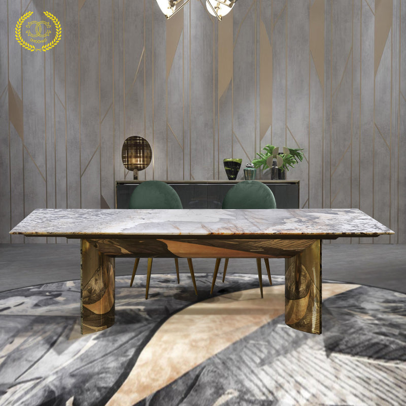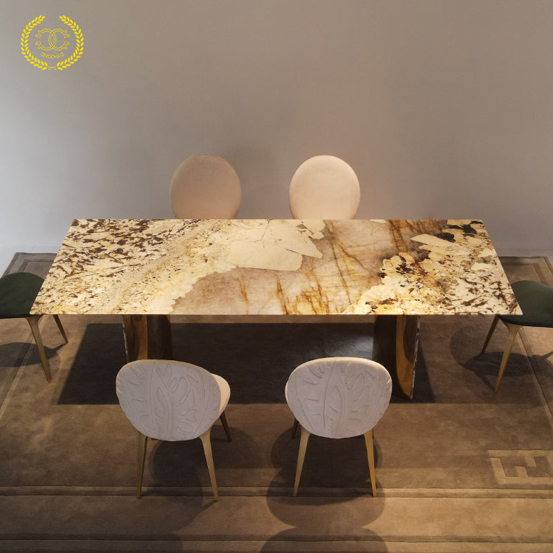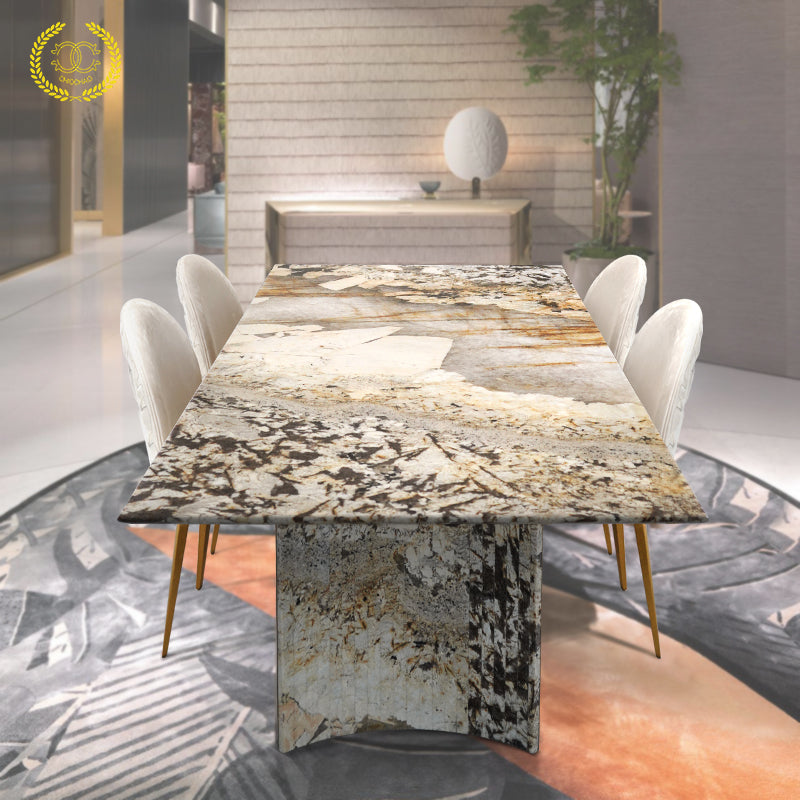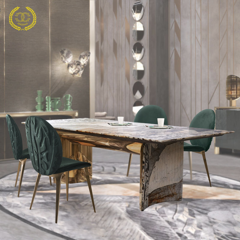 This dining table is composed of a luxurious stone tabletop and curved stainless steel base. The table size is sufficient for family gatherings and entertaining guests.
