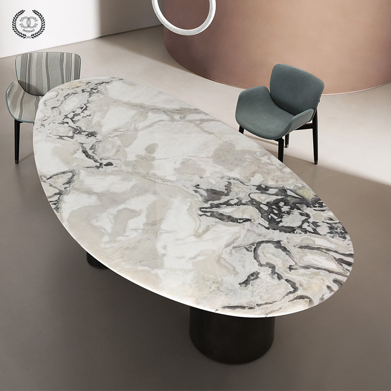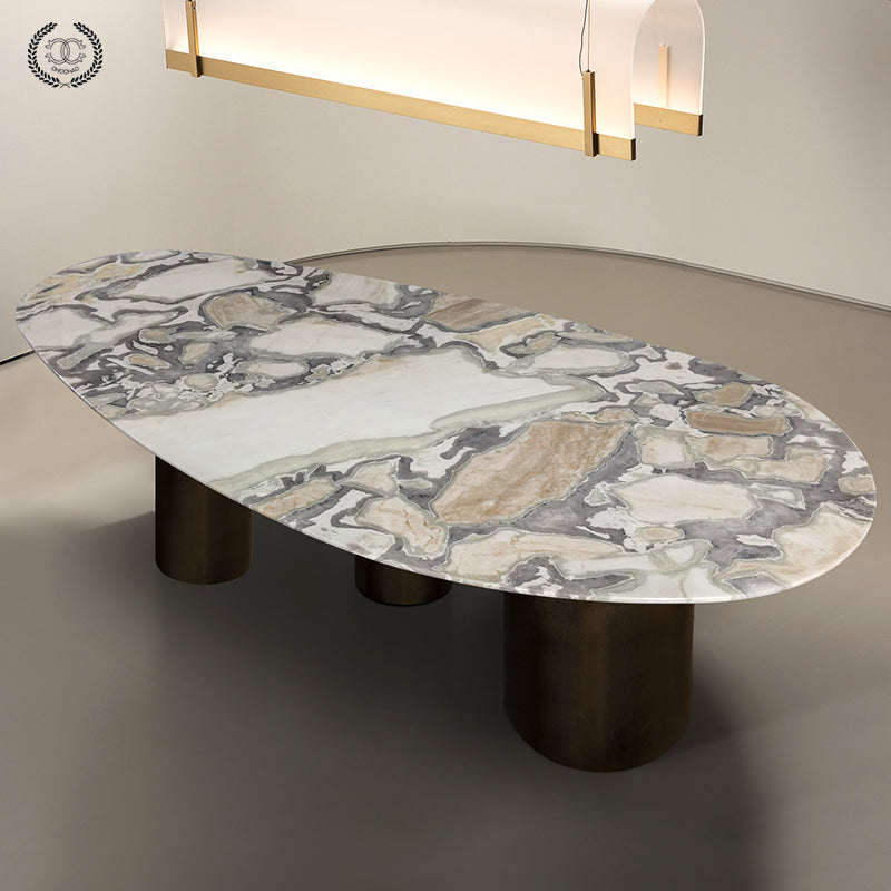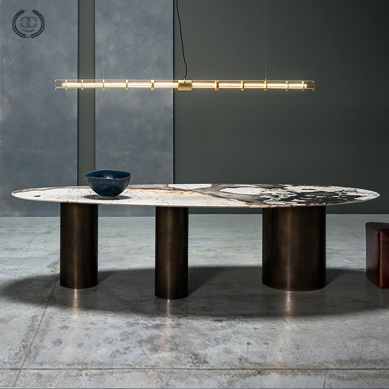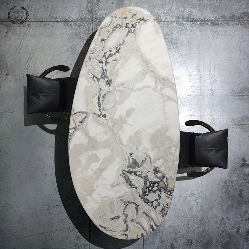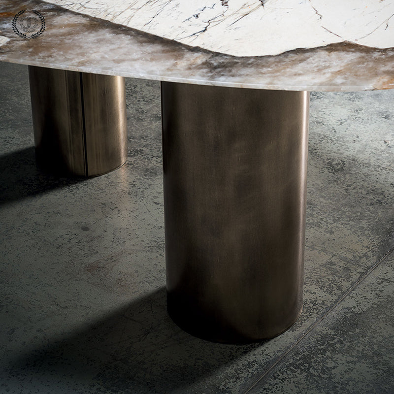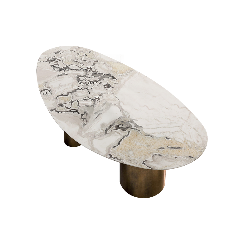 The exquisitely cut oval marble table top is supported by three cylindrical stainless steel plates. The stainless steel base color can be black or brass.