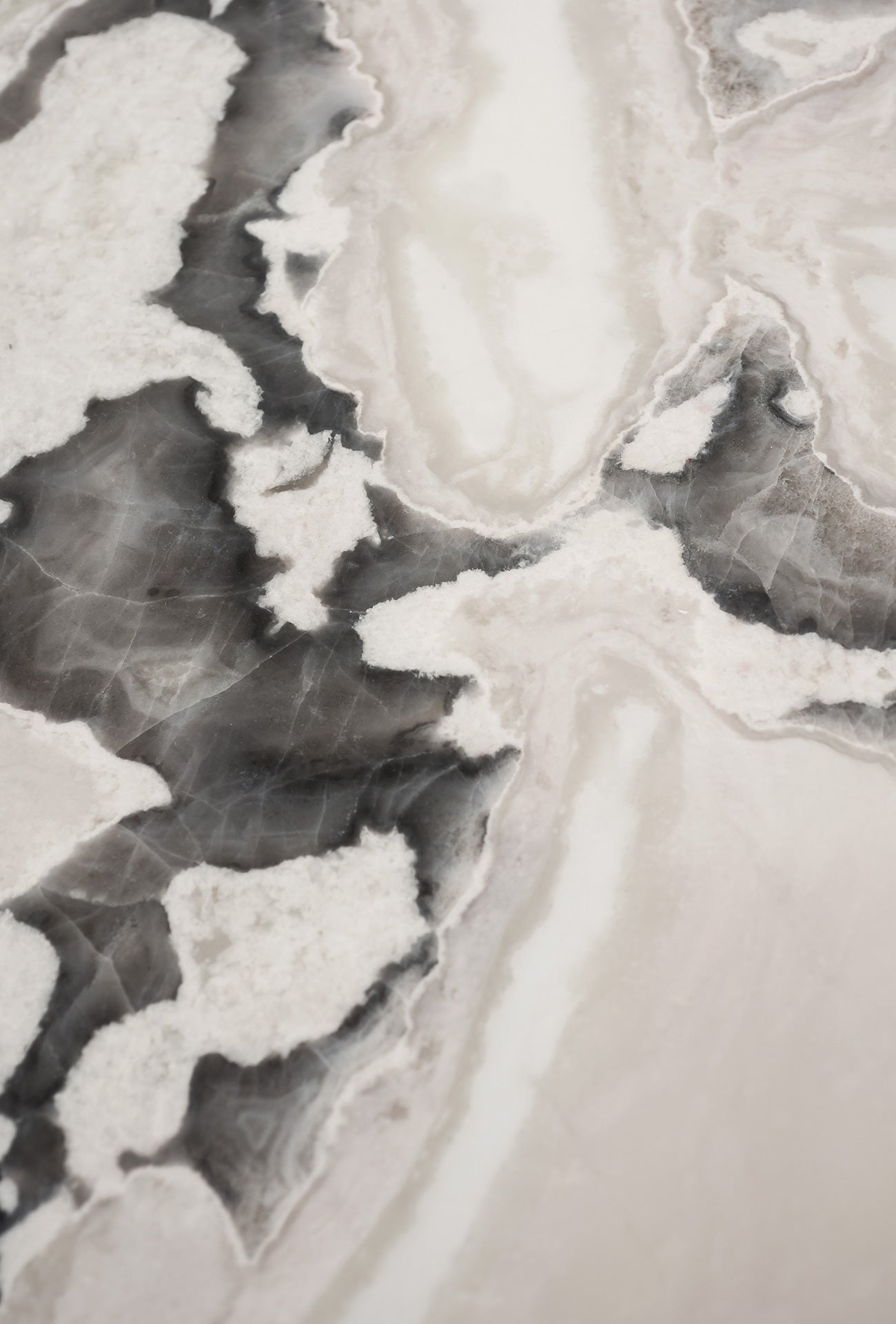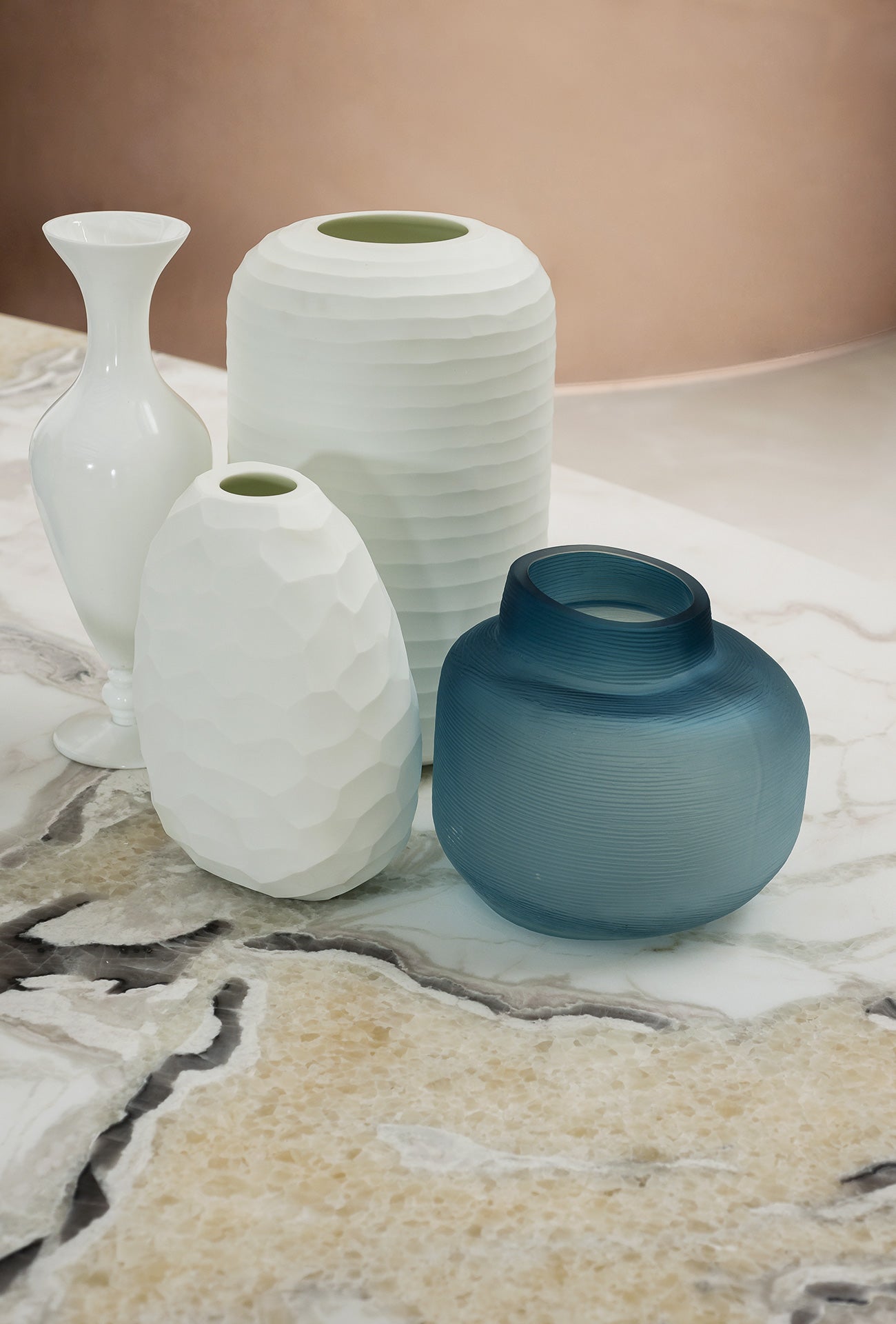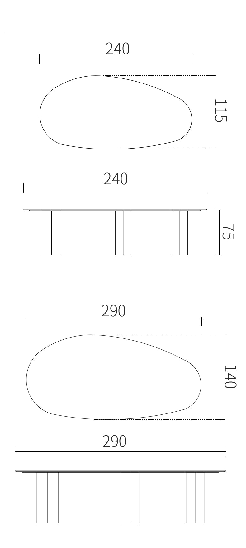 The exquisitely cut oval marble table top is supported by three cylindrical stainless steel plates. The stainless steel base color can be black or brass.