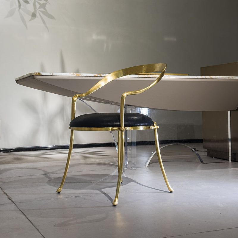 The design is inspired by the Fyton mural in Dunhuang. The sloping backrest is elastic. The chair seat cushion is made of calfskin. The filling is soft and suitable, and has elasticity when you sit on it.