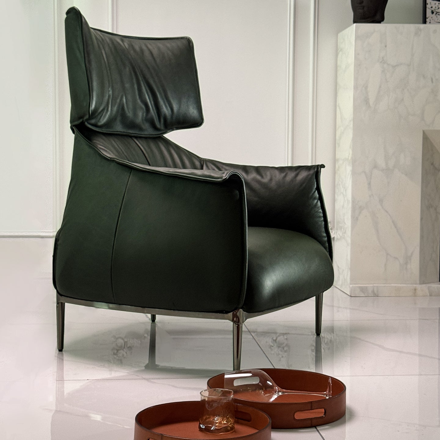 This high-back leisure armchair is made of imported vegetable-tanned cowhide, which is healthier, more durable and comfortable. The internal filling is shaped sponge, and the frame feet are made of stainless steel.