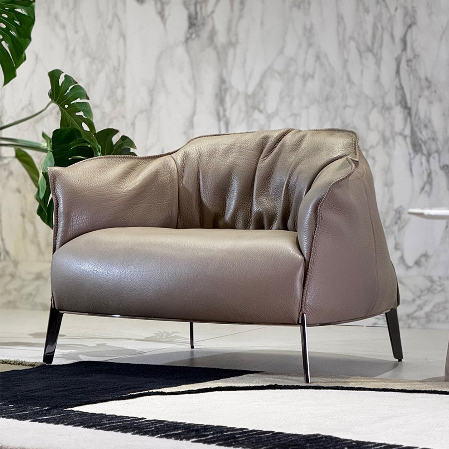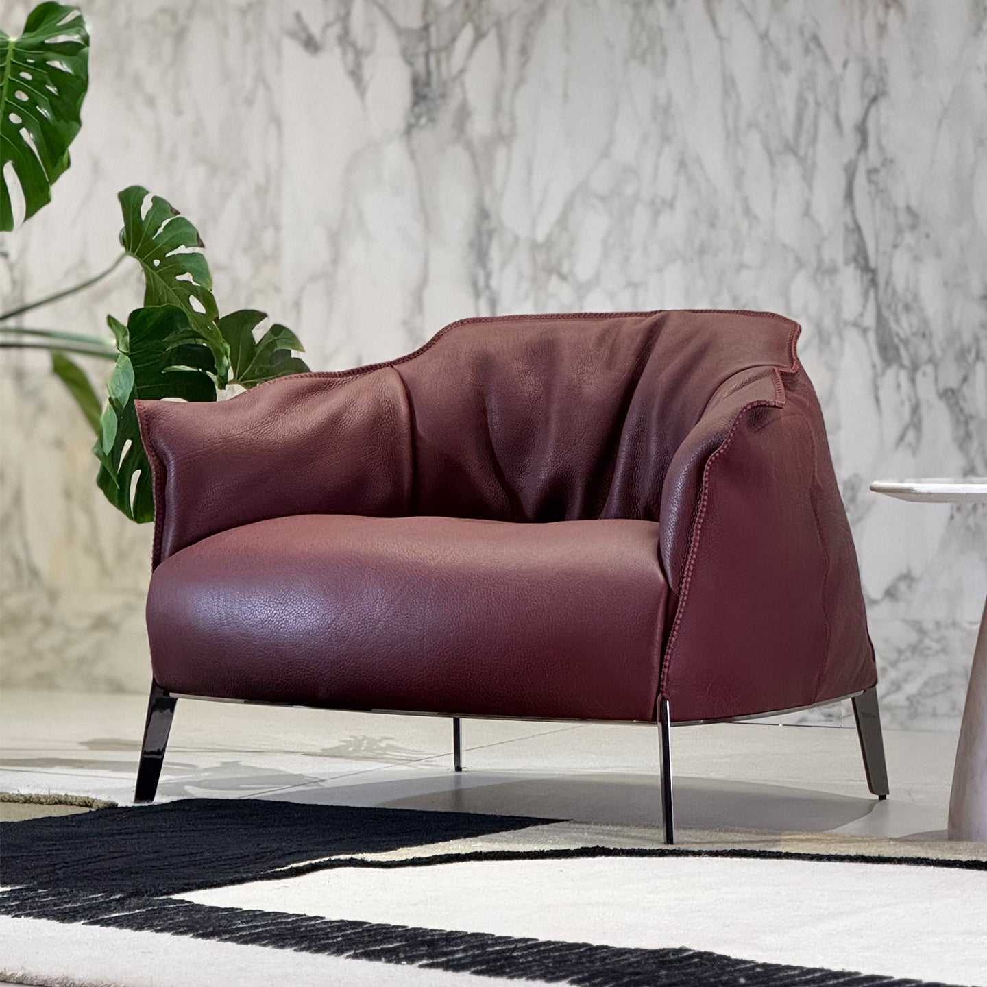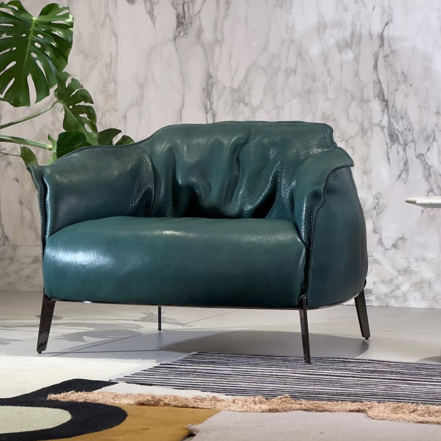 This is an extra thick leather armchair. This kind of cowhide has a natural texture. The chair is beautifully shaped and comfortable to sit on.